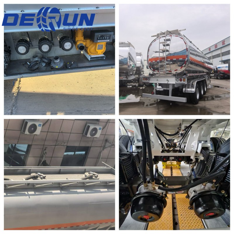 डेरन थ्री-अॅक्सल al ल्युमिनियम अॅलॉय ऑइल टँक सेमी ट्रेलरमध्ये अॅल्युमिनियम मिश्र धातुपासून बनविलेले टँक बॉडी आहे, ज्यात हलके बांधकाम आणि गंज प्रतिकार आहे. अंतर्गत अँटी-स्लोश प्लेट्स आणि कंपार्टमेंट्स द्रव हालचाल प्रभावीपणे दडपतात, वाहतुकीदरम्यान स्थिरता वाढवते. शीर्षस्थानी मॅनहोल कव्हर आणि वाष्प पुनर्प्राप्ती इंटरफेससह सुसज्ज आहे, तर तळाशी वायवीय आणीबाणी ब्रेक वाल्व आहे, जे सर्व अर्जेंटिना लोडिंग आणि अनलोडिंग नियमांचे पालन करतात. एक पांढरा प्रतिबिंबित कोटिंग सूर्यप्रकाशापासून तापमानात वाढ कमी करते, इंधन बाष्पीभवन नुकसान कमी करते. टाकीच्या शेपटीमध्ये लिक्विड लेव्हल सेन्सरसाठी आरक्षित इंटरफेस समाविष्ट आहे, ग्राहकांद्वारे बुद्धिमान देखरेख प्रणालीची भविष्यातील स्थापना सुलभ करते.