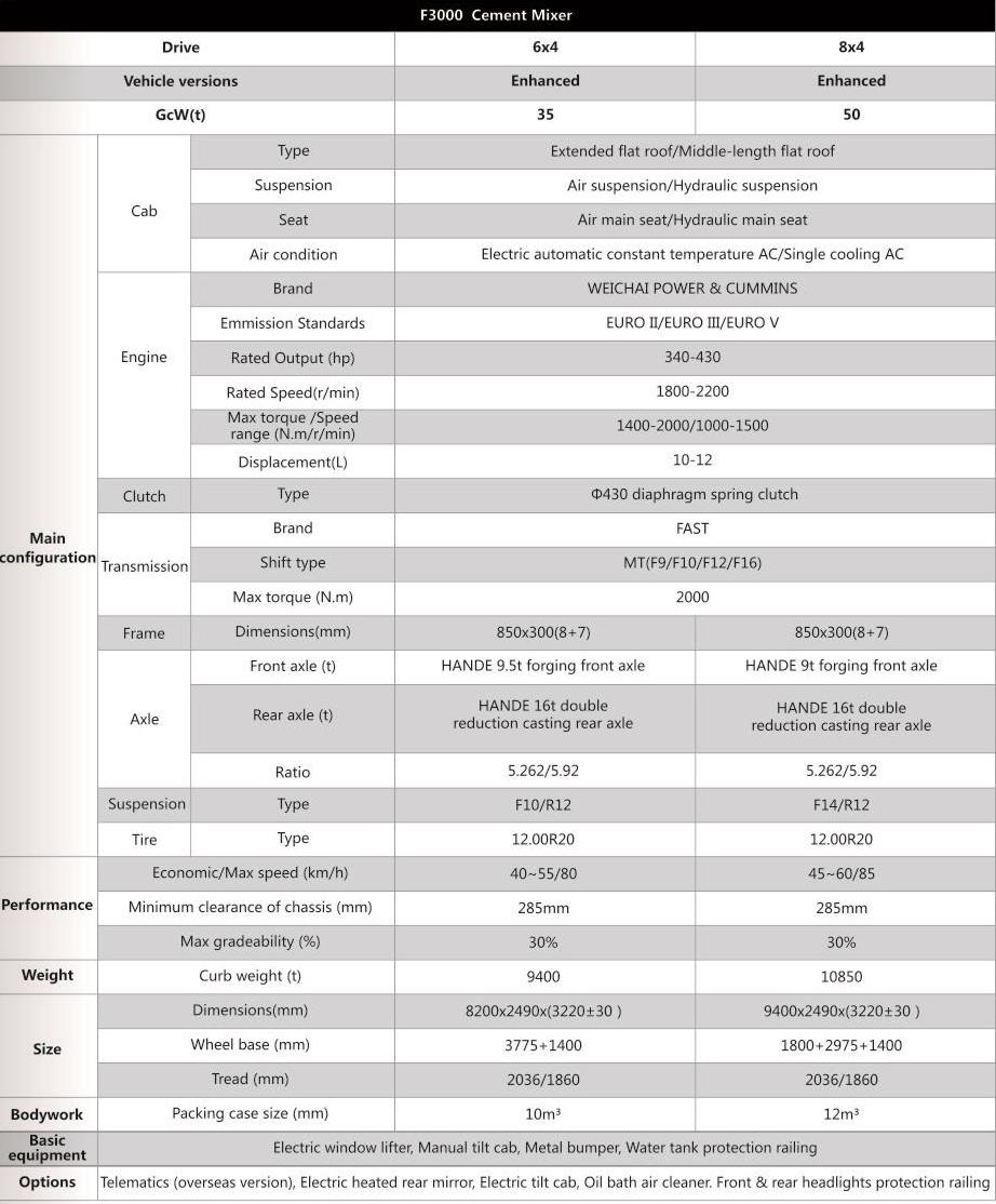 हा ट्रक शांक्सी ऑटोमोबाईलच्या एफ 3000 मालिका चेसिसचा अवलंब करतो, ज्यात सॉलिड शीट मेटल आणि मजबूत लोडिंग क्षमता आहे. उंचीच्या निर्बंधाच्या खांबाचा त्रास टाळण्यासाठी त्याचे ‘फ्लॅट हेड’ डिझाइन शहरात प्रवेश करणे आणि बाहेर पडणे सुलभ करते. ड्रायव्हिंगचा अनुभव वाढविण्यासाठी टॅक्सी एअरबॅग आणि शॉक-शोषक जागांनी सुसज्ज आहे. टॉप-माउंट मिक्सिंग टँक आणि ब्लेड अॅलोय स्टील आणि वेअर-प्रतिरोधक सामग्रीचे बनलेले आहेत, जे टाकीच्या सर्व्हिस लाइफमध्ये मोठ्या प्रमाणात सुधारित करते.